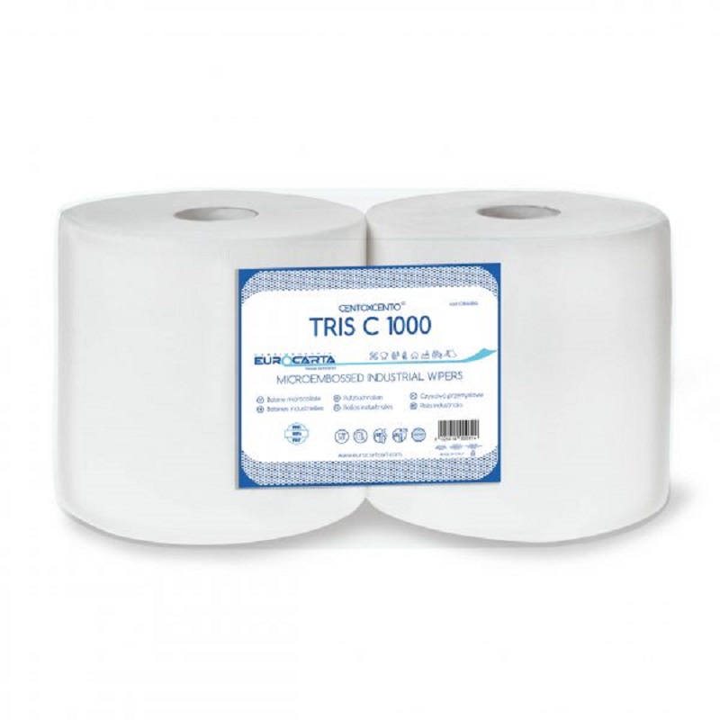 Rola hartie industriala, alba, Eurocarta Tris C 1000, in 3 straturi, celuloza pura, gofrata si laminata.